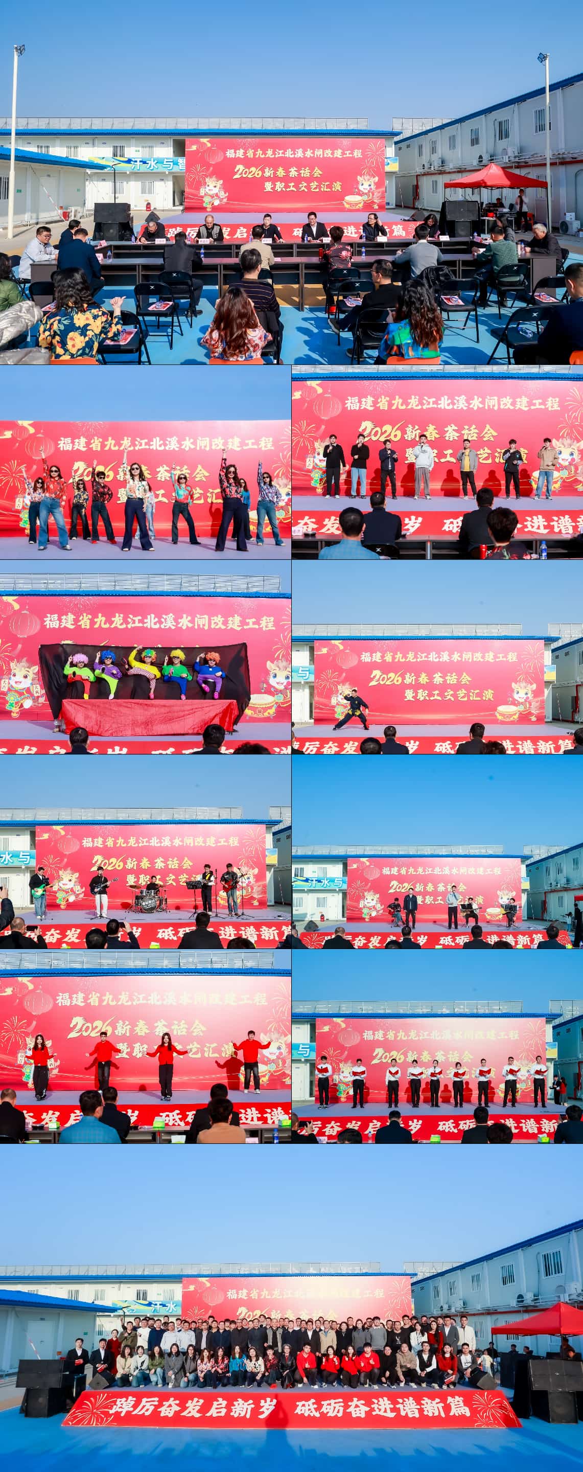 新春茶话会上,各单位代表深入交流,全面回顾2025年北溪水闸改建工程建设成效,细致谋划2026年工作目标与推进举措,向全体一线建设者致以诚挚新春问候,勉励各方深化协作、务实奋进,凝聚合力推动工程建设提质增效。随后,与会人员共同观看了参建各方自编自演的文艺节目。中心妇委会《舞蹈串烧》燃情开场,各参建单位精心呈现乐队演奏、太极剑、歌曲演唱、舞蹈、朗诵、小品、相声等十余个节目,生动融入水利人坚守一线、攻坚克难的奋斗点滴与心系家国、守护安澜的赤子情怀。茶话会在全体人员齐声合唱《明天会更好》中落幕,现场暖意融融,充分展现了水利人团结向上、昂扬奋进的精神风貌。