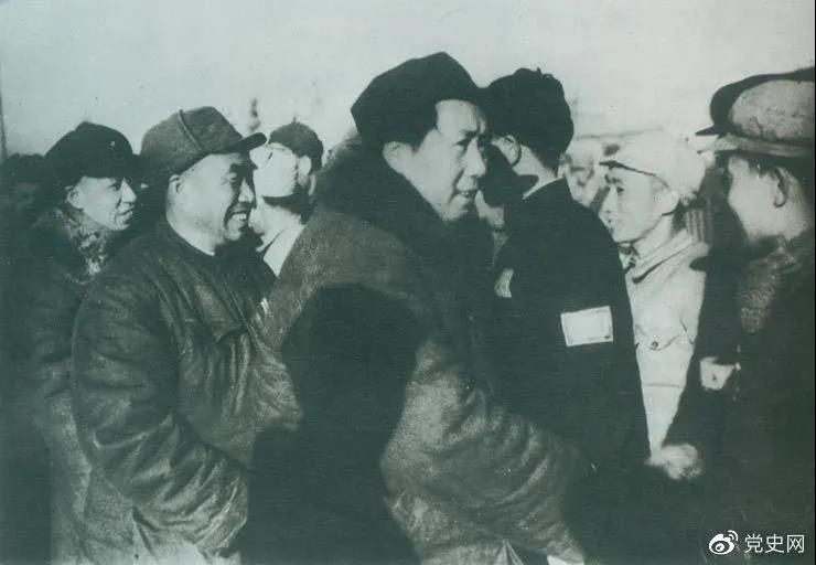 图为毛泽东、朱德、刘少奇到达北平西苑机场时与欢迎者握手。