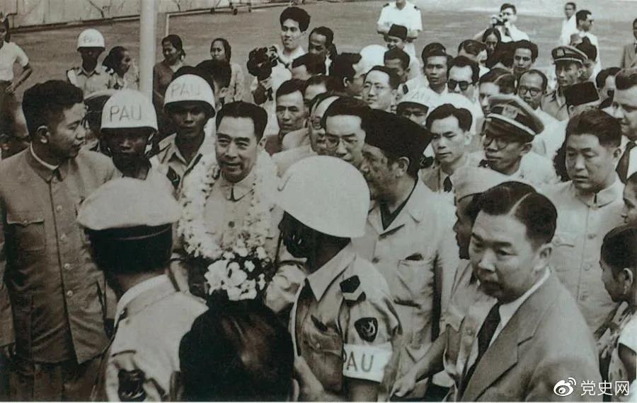 图为1955年4月17日,周恩来率中国代表团抵达万隆,受到万隆各界人民的热烈欢迎。