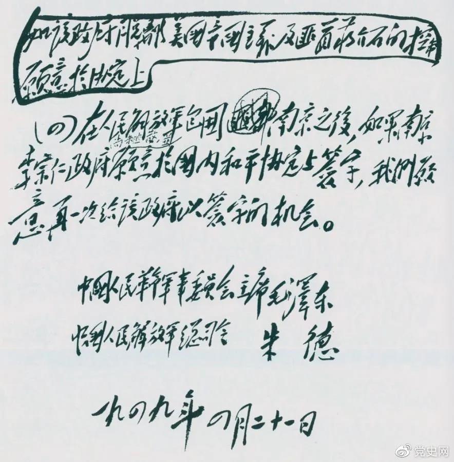 中国人民革命军事委员会主席毛泽东、中国人民解放军总司令朱德发布《向全国进军的命令》,命令中国人民解放军奋勇前进,坚决、彻底、干净、全部地歼灭中国境内一切敢于抵抗的国民党反动派,解放全国人民,保卫中国领土主权的独立与完整。命令还指出:对于凡愿停止战争、用和平方法解决问题的国民党地方政府和地方军事集团,可以按照《国内和平协定》的大意,同他们签订地方性的和平协定。二十三日,人民解放军占领国民党统治的中心南京。二十四日,新华社发表毛泽东写的新闻稿指出:在人民解放军百万大军攻击之下,千余里国民党长江防线全部崩溃,南京国民党反动卖国政府已于昨日宣告灭亡。这个命令收入《毛泽东选集》第四卷。