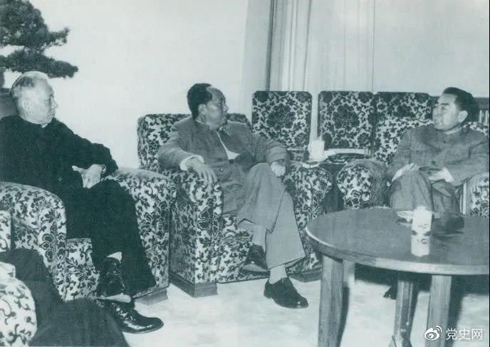 1960年4月,毛泽东同周恩来、刘少奇在北京钓鱼台国宾馆交谈。
