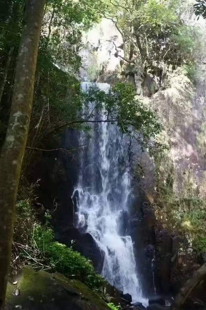 水墨瀑布:崖壁风化石如嶙峋山影,水流似墨色晕染